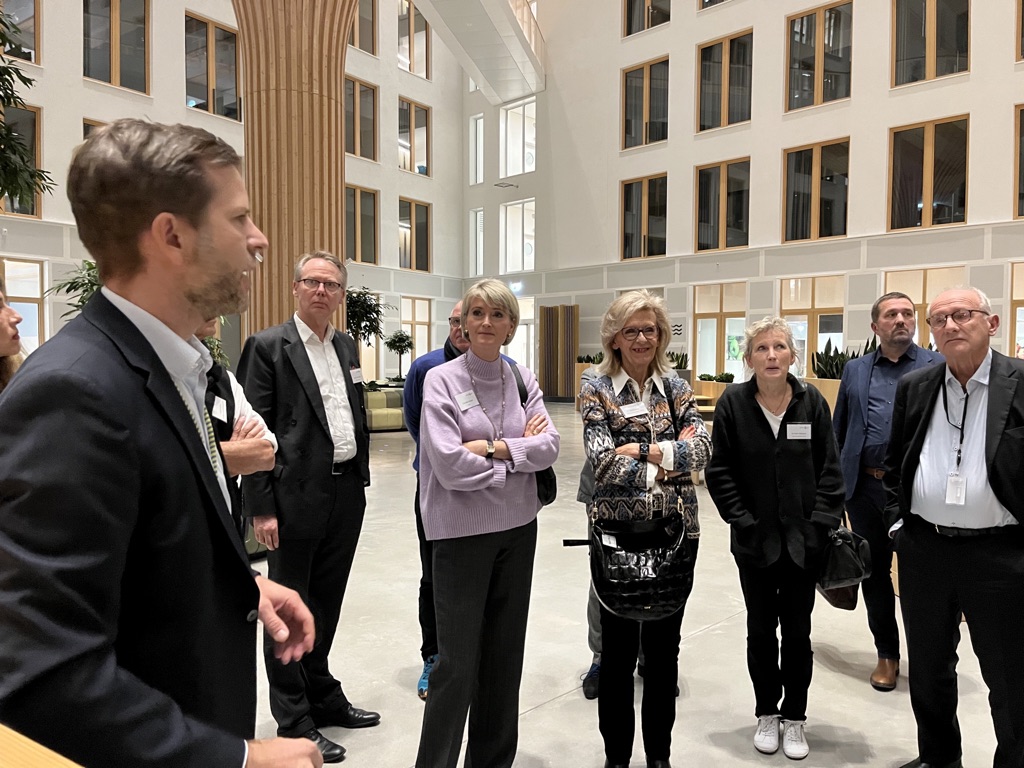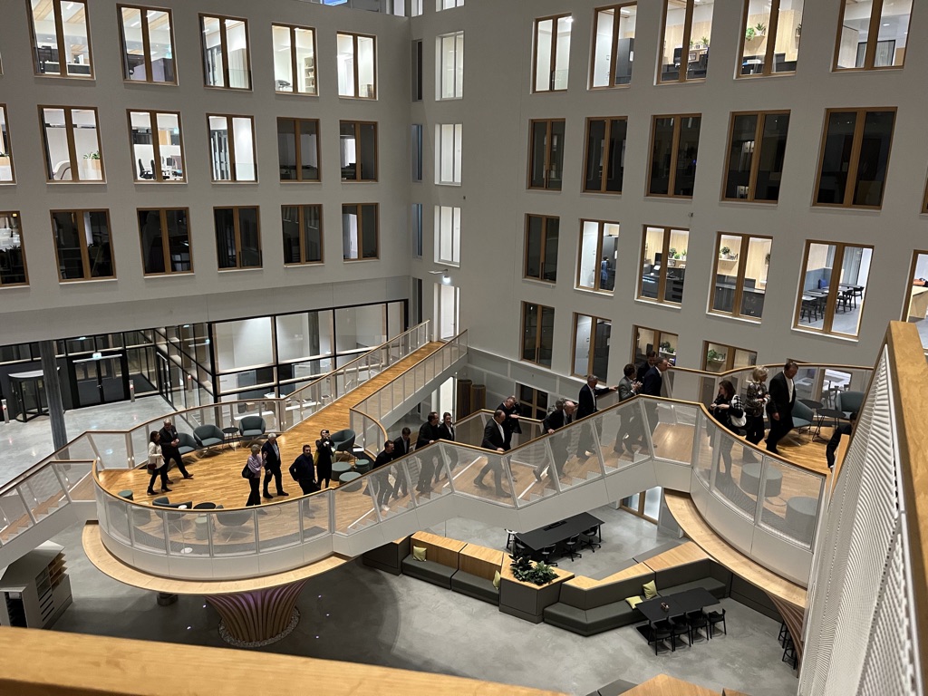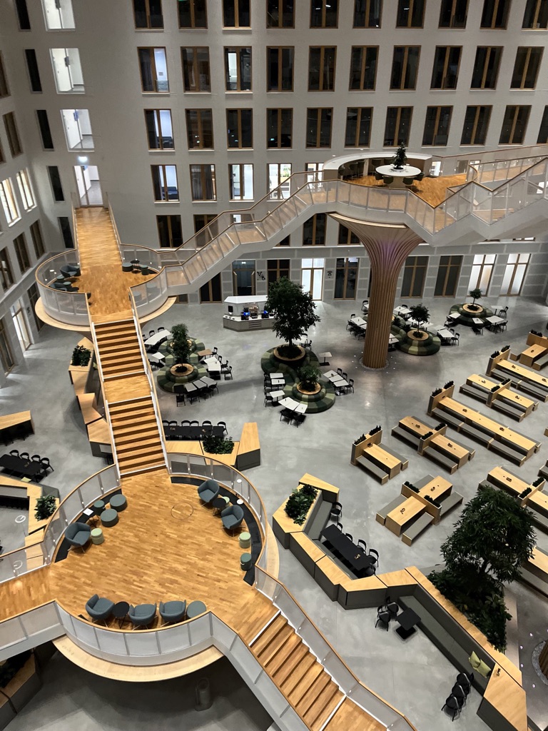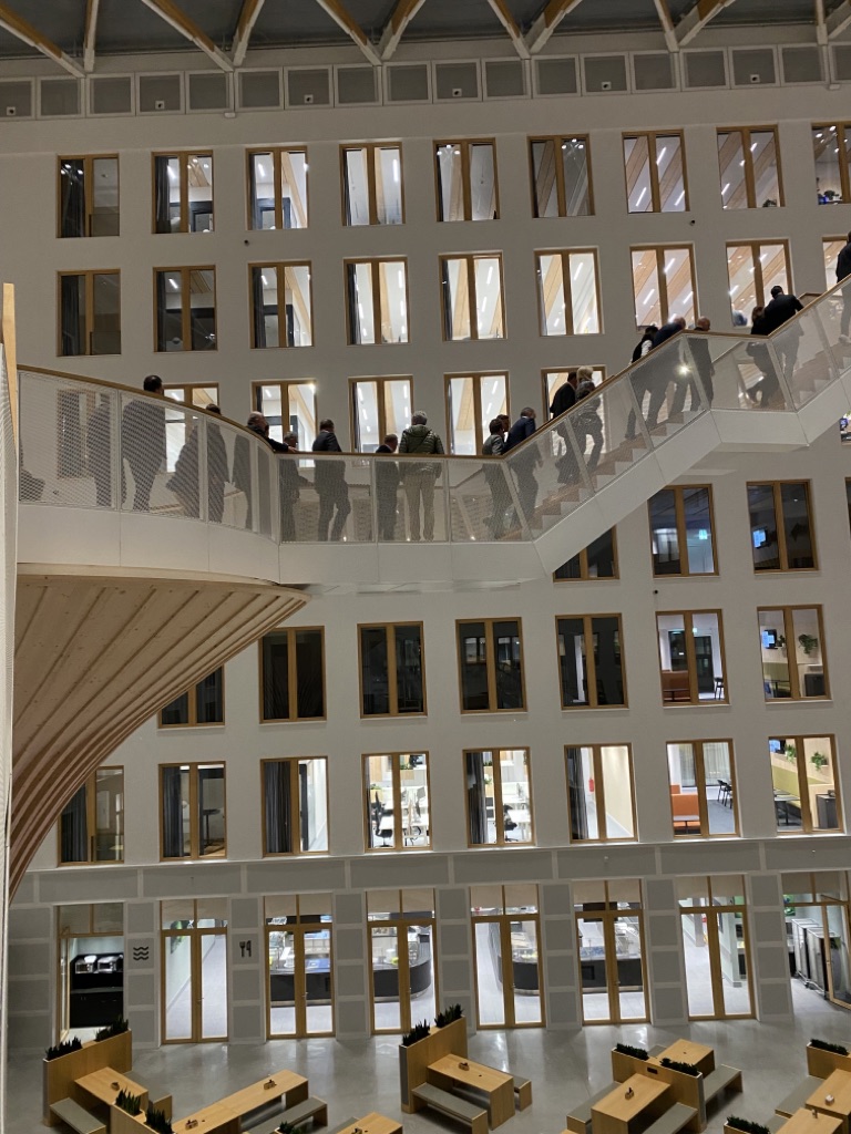Thema: Führung zwischen Treppenskulptur und Skylounge vom neuen Hausherrn, Herr Helge Rugor, Vice President Real Estate & Facility Management + Hintergrundinformationen zu Nachhaltigkeit und Innovation zum Gebäude, Anastasiya Vitusevych, Developement Manager EDGE